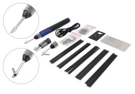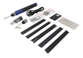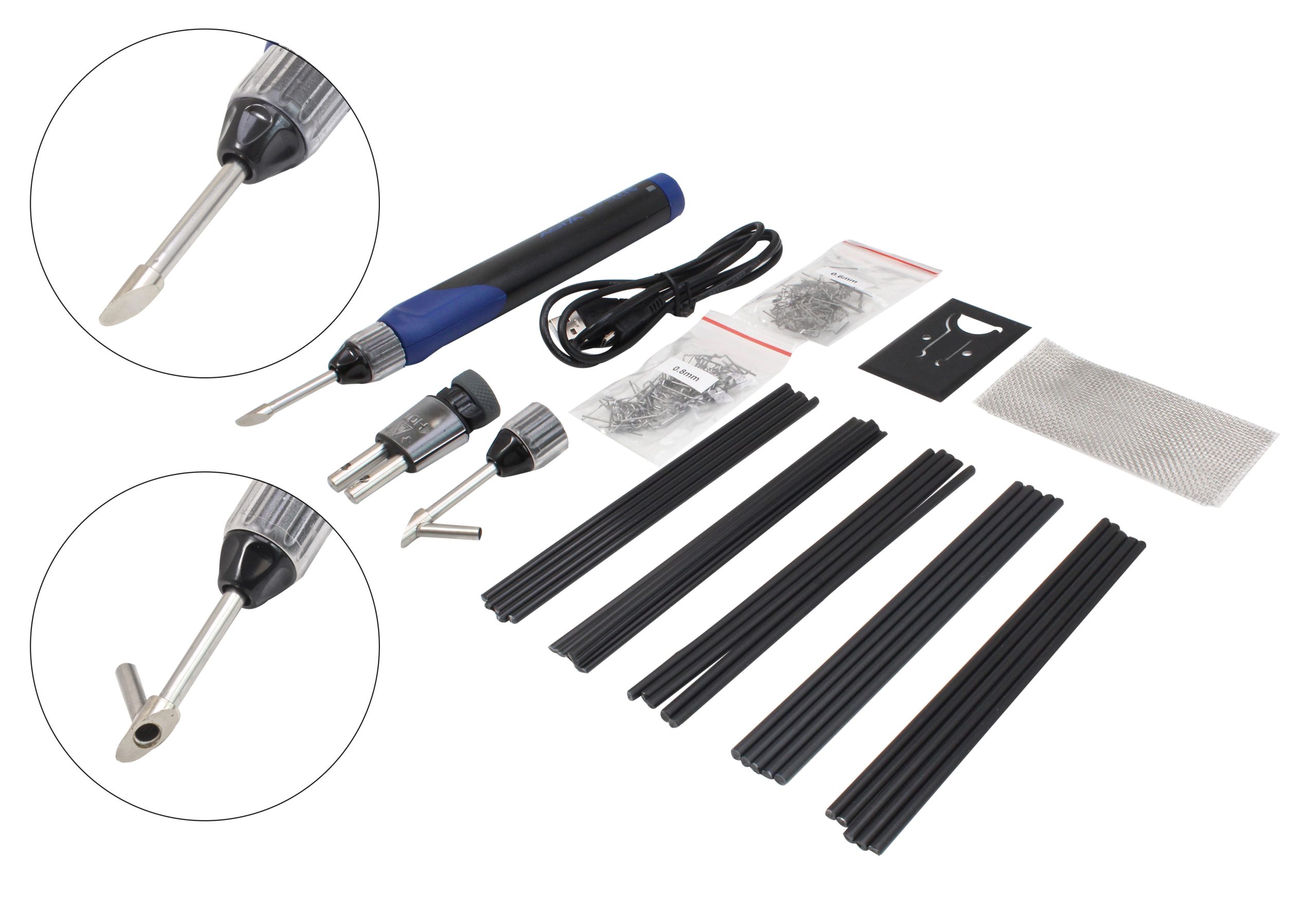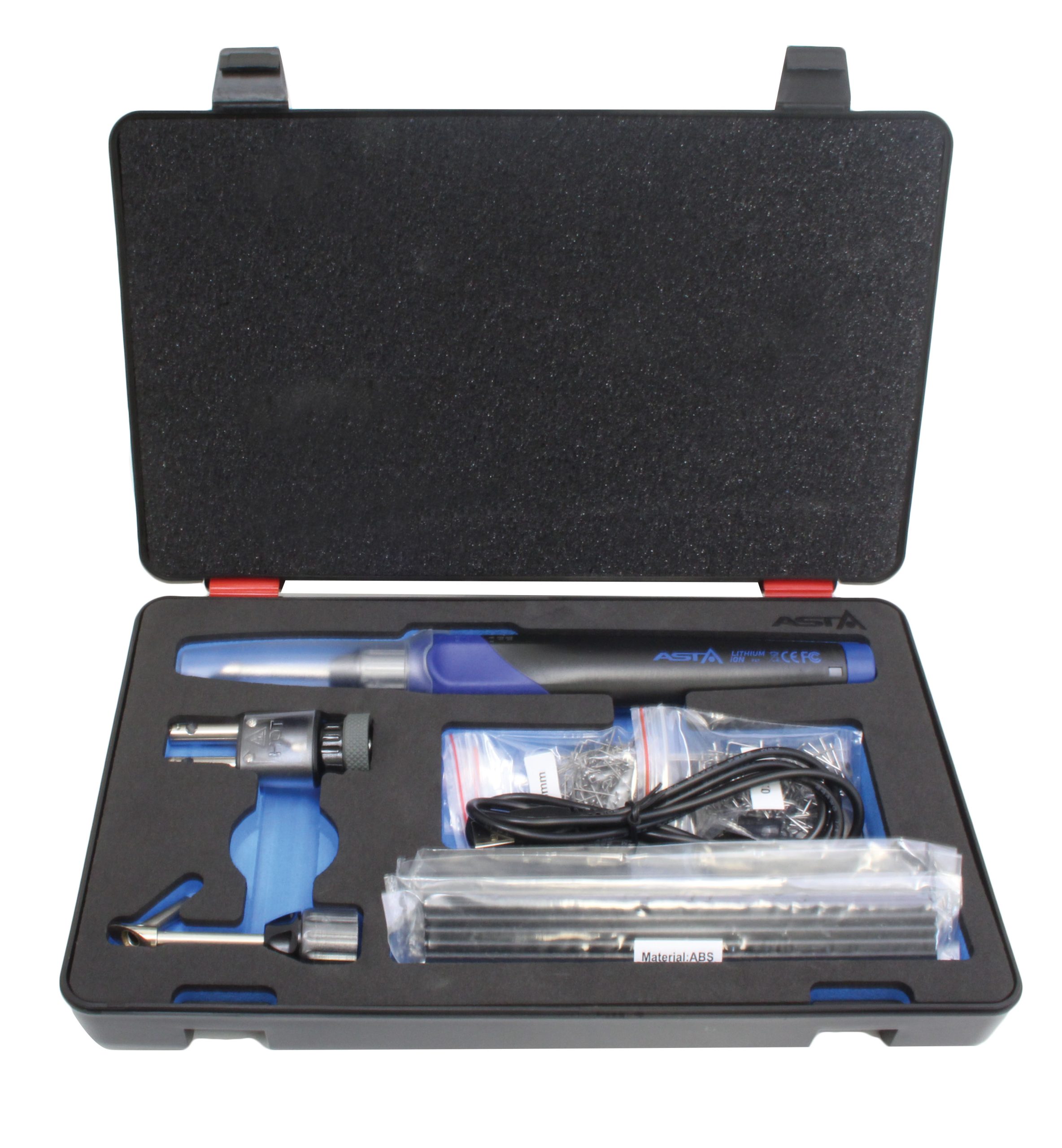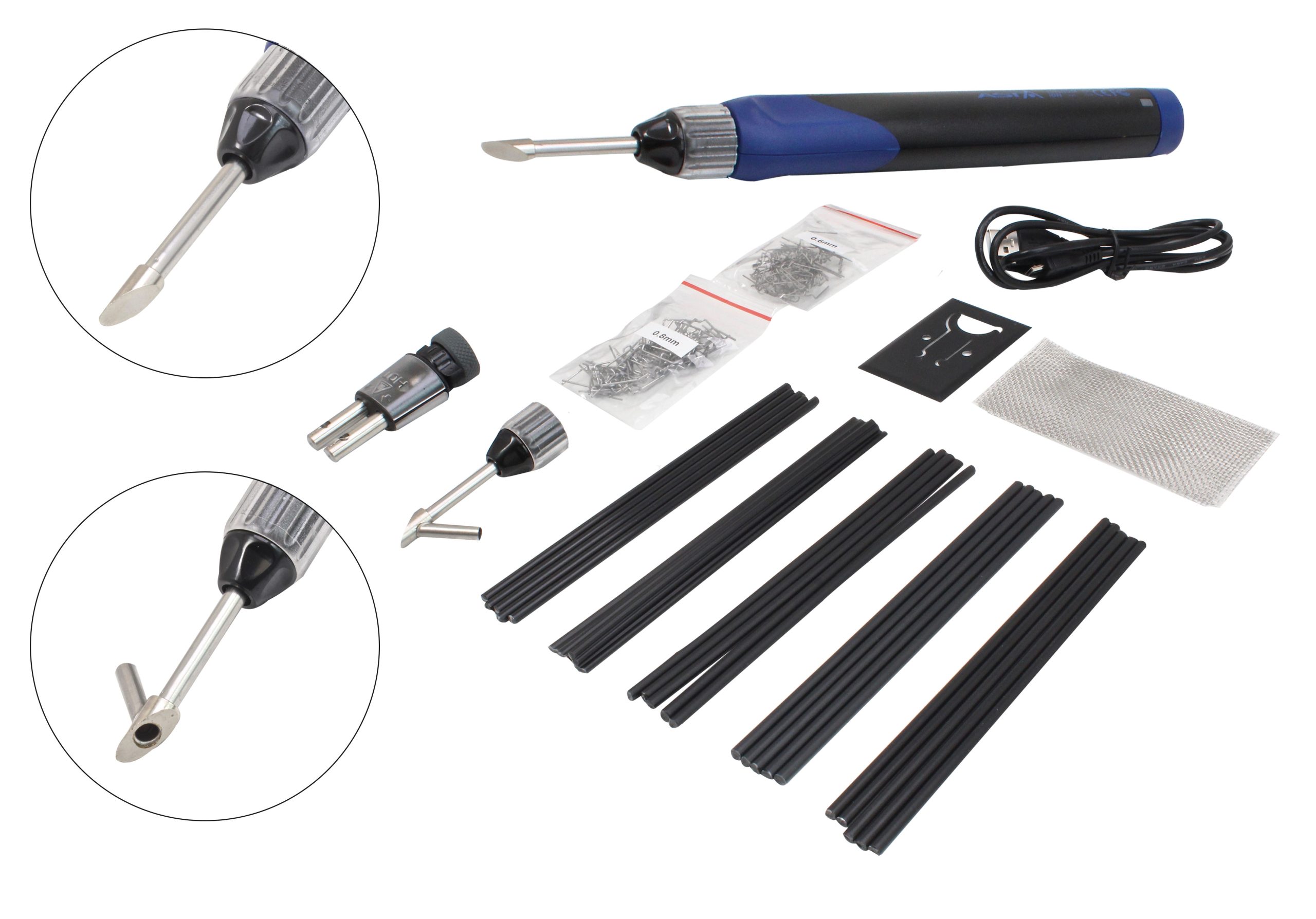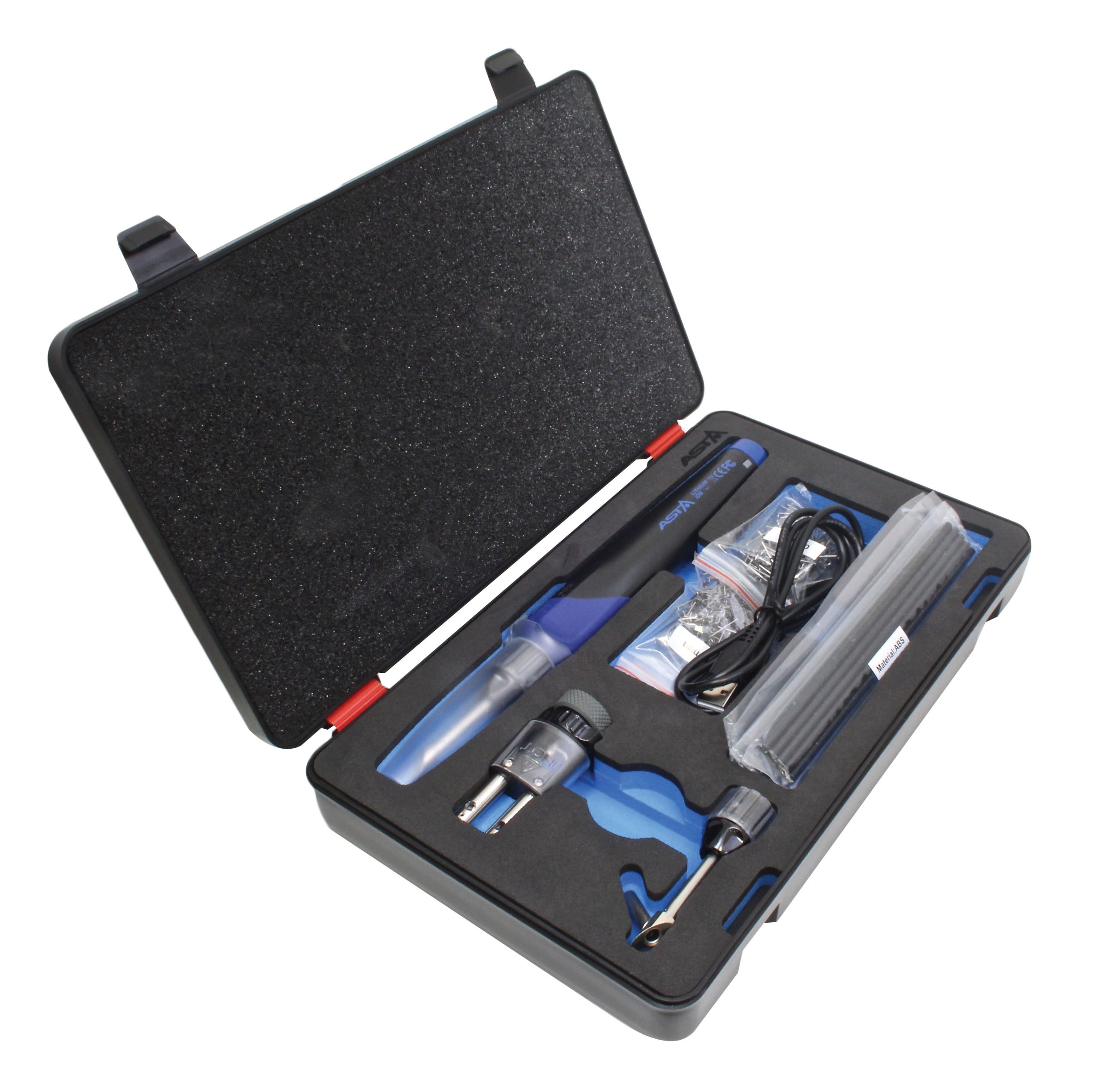 The ASTA A-30WPH has an innovative design, interchangeable tips, an ergonomic grip handle, inbuild LED work light, safety switch and cap, overcharge protection, over discharging, short circuit, ESD (Electrostatic Discharge) and EMC, EN62133, CE approved and UL listed. Working time about 40min (2500mAh Battery), heat time 8sec and charging time 3.5 hrs Plastic welding tip: Max. temp 500°C, Plastic welding with stainless pipe guide: Max. temp 420°C, Hot Staples Tip: complete to bridge the cracked area together in few seconds. Application: Specially designed for precision and general joints, integrated circuit work, wire connection, heavy duty soldering applications, cutting plastic and synthetic rope, cutting and sculpturing Styrofoam, woodworking and wood crafting, heat shrinking and lighter purpose (no open flame). Set includes: 12pcs of plastic welding rods, 150mm in length each rod, including ABS/PP/PE/PS material; 3pcs of reinforcing stainless steel wire mesh, 50mmx100mm; 50pcs of flat staples, alloy wire 0.8mm in diameter + 50pcs of flat staples, alloy wire 0.6mm in diameter, both not breakable. USB charging cord set + safety stand