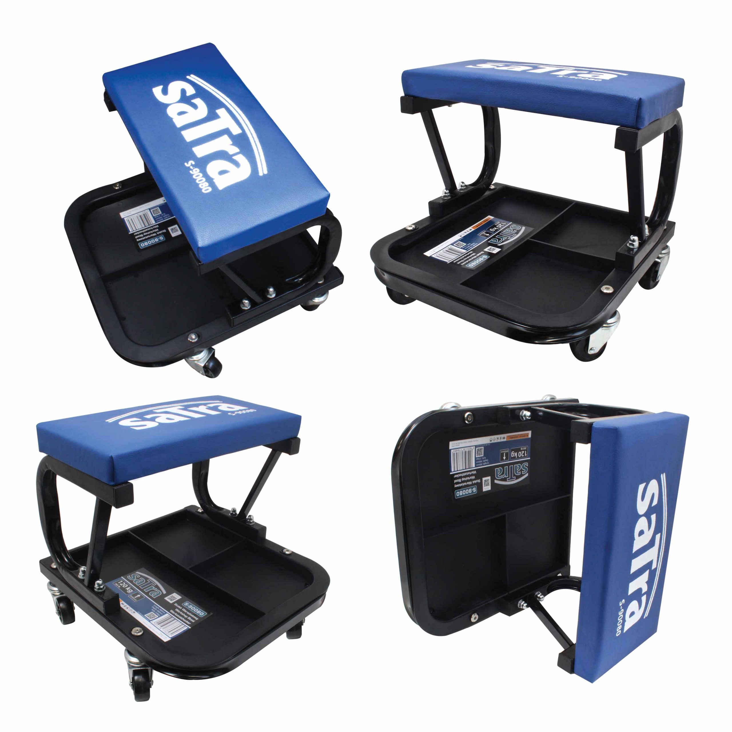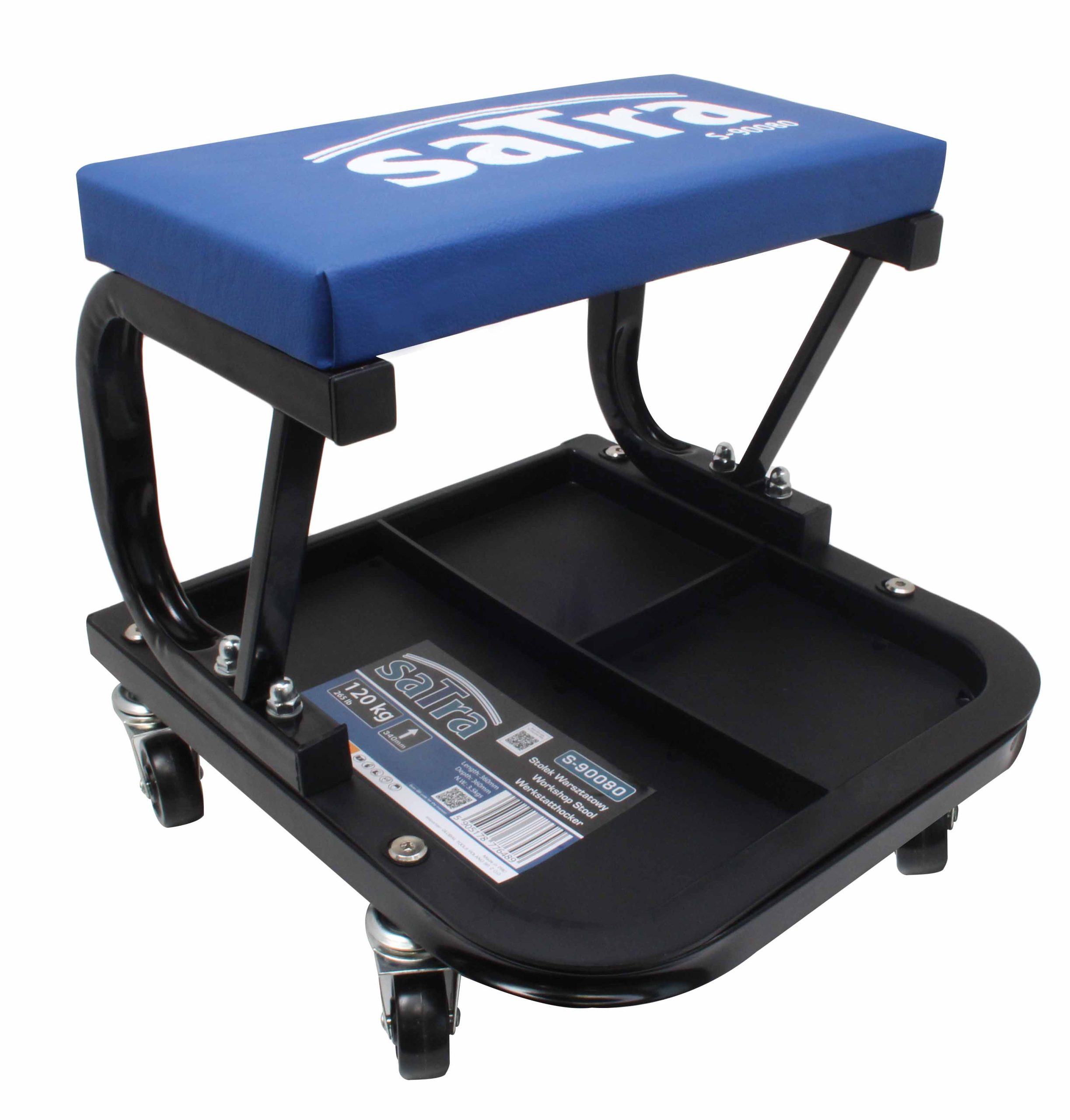 SATRA Workshop Stool on Wheels with Tool Tray is a practical and comfortable tool that is indispensable in any garage or automotive workshop. Thanks to its mobile wheeled design and comfortable seat, it significantly facilitates work on low-positioned vehicle components. The stool’s structure is made of durable steel profiles coated with powder paint, which greatly extends its lifespan and protects against corrosion.