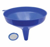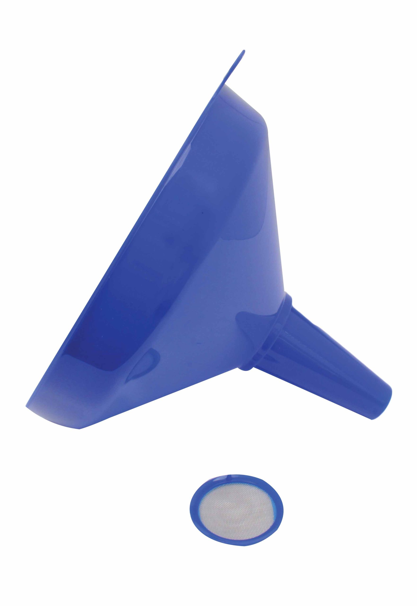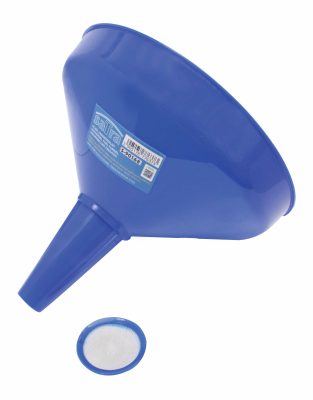 A universal large-diameter funnel (250 mm) made of durable plastic is an essential tool for every workshop, garage, or household. It is suitable for water, coolant, windshield washer fluid, engine oil, and other automotive or household fluids. Its universal design and wide opening make it compatible with most filling ports. The built-in filter mesh effectively traps impurities, ensuring that transferred liquids remain clean and free from contaminants.