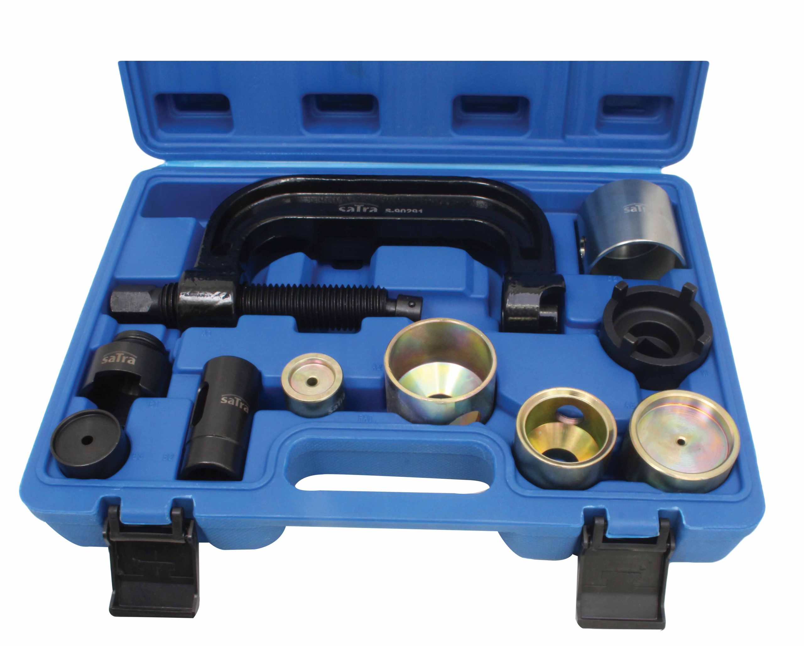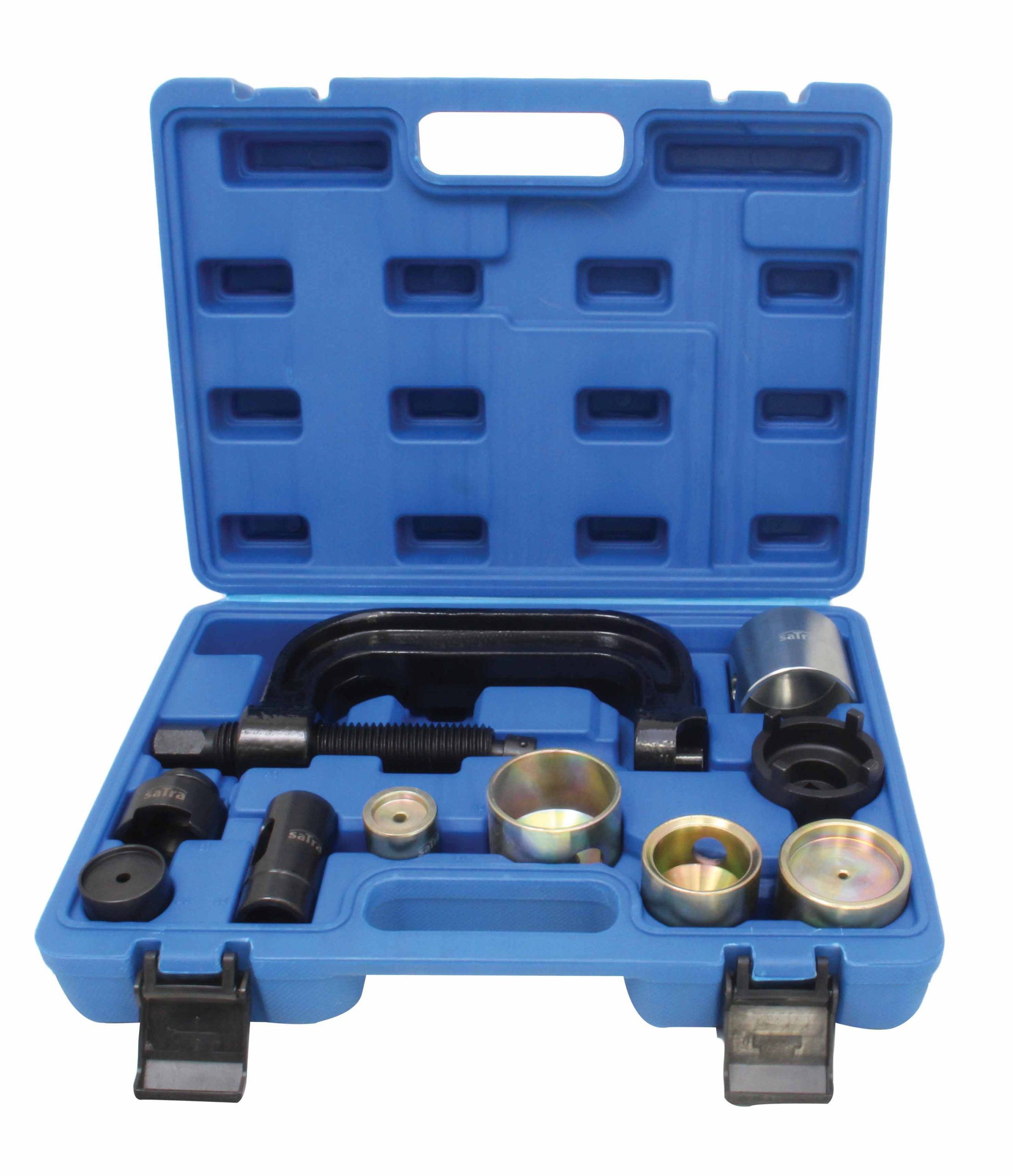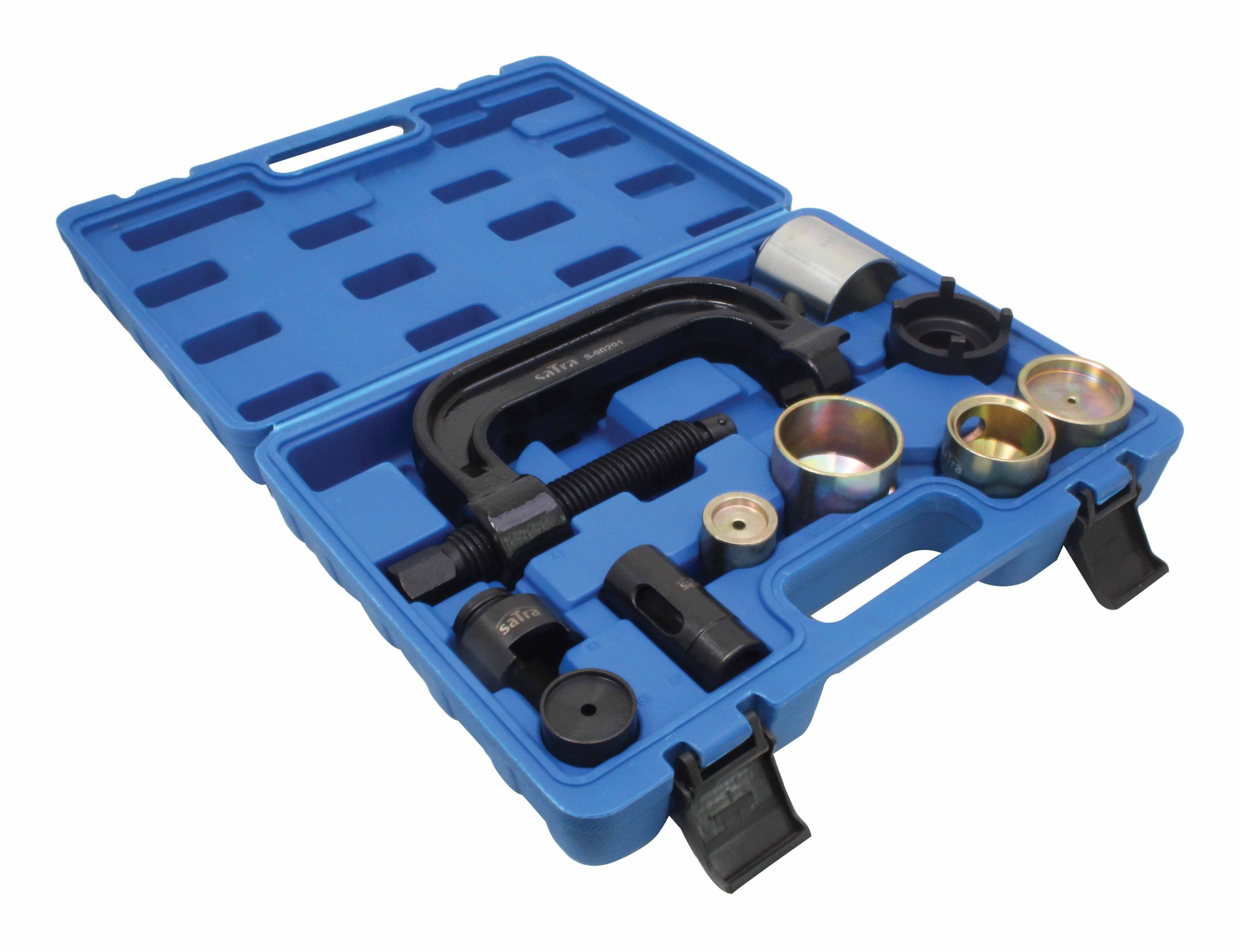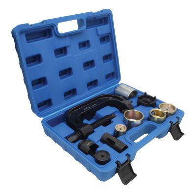The set includes pressing components for removing and installing ball joints in control arms and rubber bushings in both the front and rear suspension.