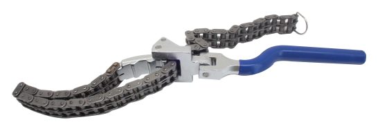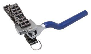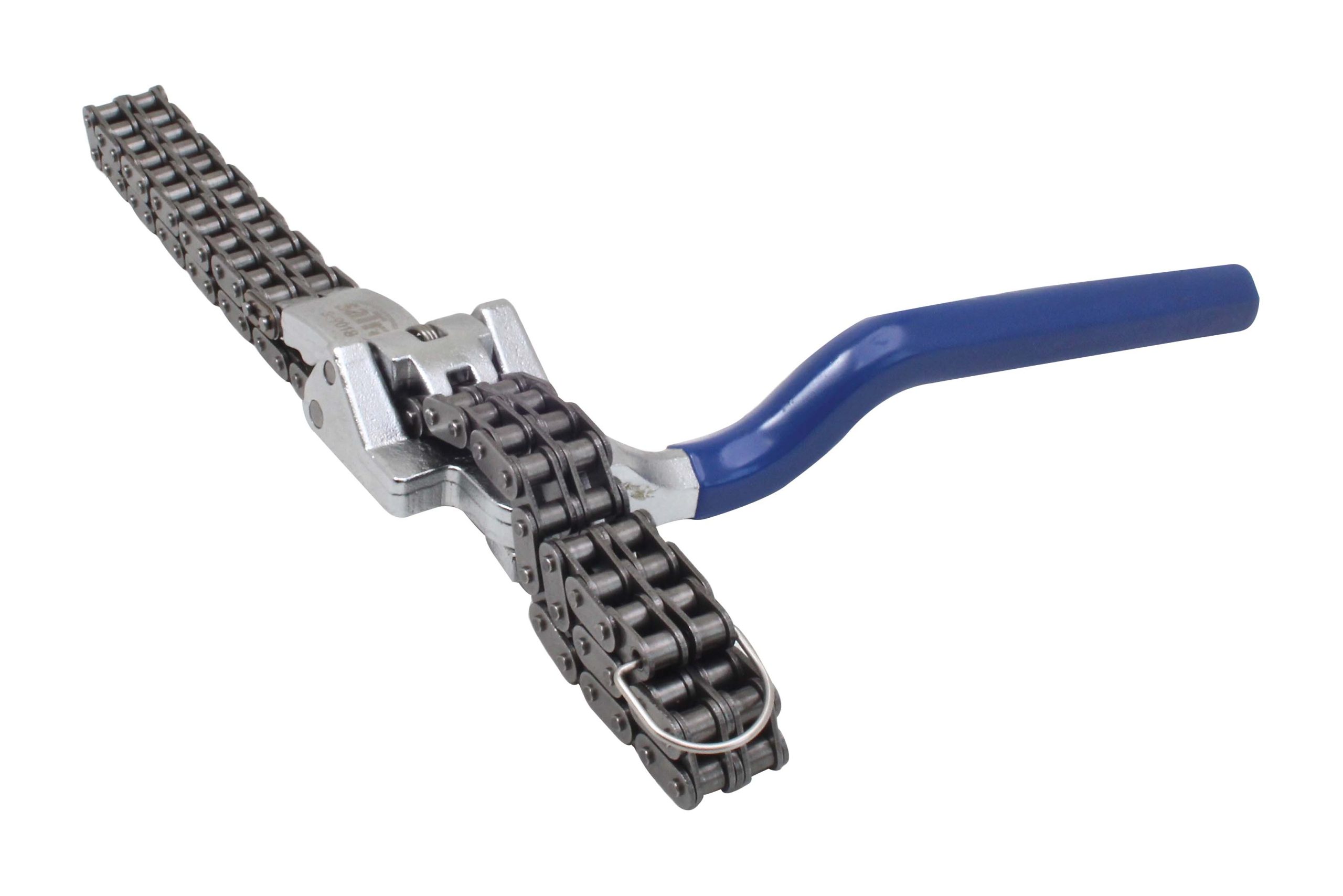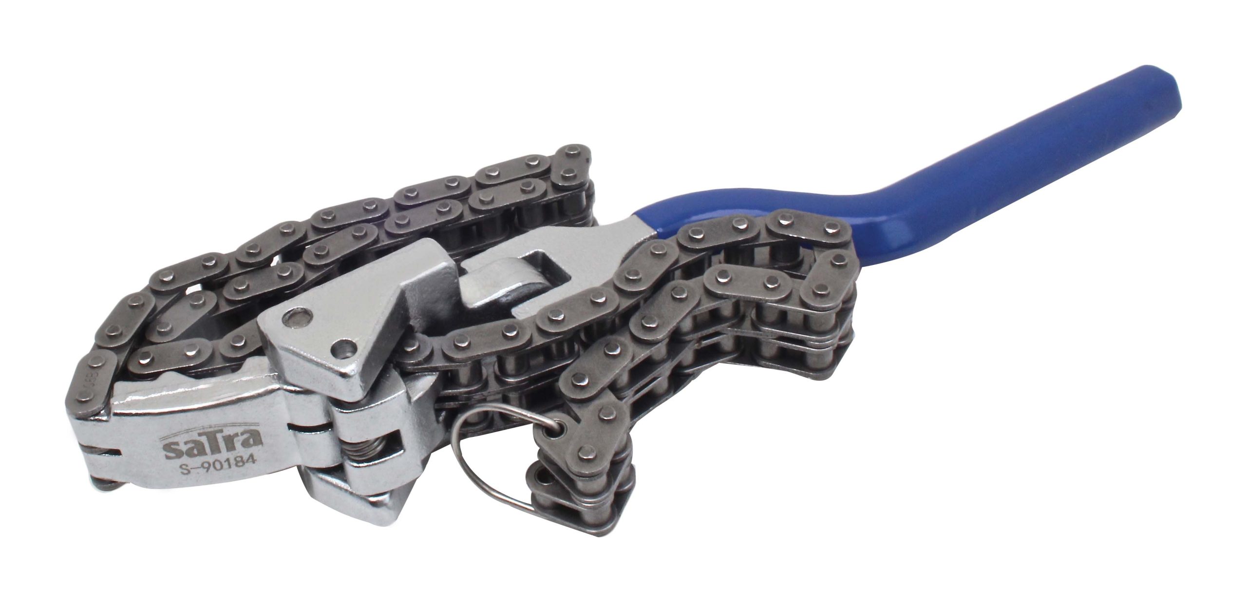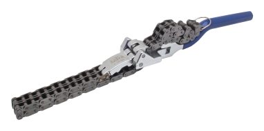 Heavy-duty steel chain features a spring locking mechanism and 180° swivel handle for flexible use in tight areas.