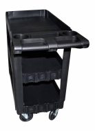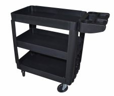 The trolley features three spacious shelves for convenient organization of tools and accessories, as well as an ergonomic handle for easy pushing or pulling. An additional side tray is included for storing small tools, screws, or accessories, providing quick access during work.